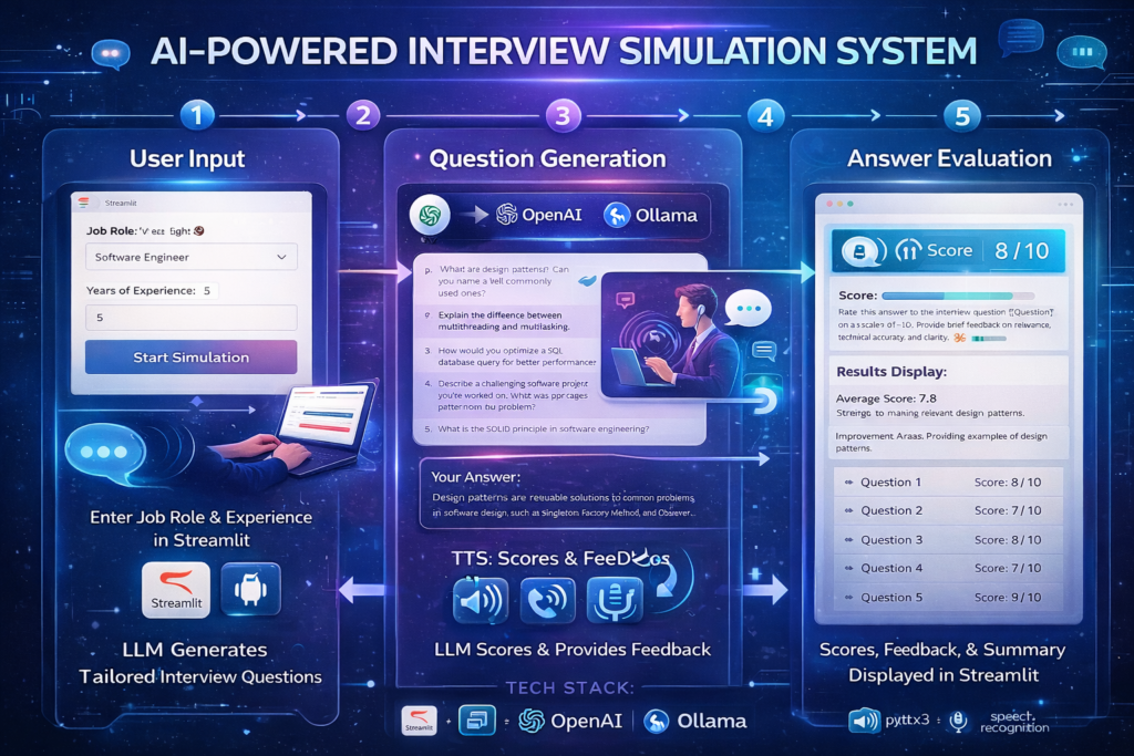 The AI-Powered Interview Simulation System is an intelligent, interactive platform designed to simulate real-world technical interviews using artificial intelligence and voice-based interaction, built entirely on open-source technologies. The system allows users to input their job role and years of experience through a Streamlit web interface, based on which a locally hosted, open-source language model dynamically generates tailored technical interview questions without relying on external APIs or cloud-based services. Each question is delivered via text-to-speech, enabling a realistic interview experience, while user responses are captured through speech recognition and transcribed in real time. The transcribed answers are analyzed by the local AI model to assess relevance, technical accuracy, and clarity, generating scores and concise feedback for each response. A comprehensive results dashboard presents individual scores, overall performance metrics, strengths, and areas for improvement, providing users with actionable insights to enhance their interview readiness. Built using Streamlit, open-source language models, and integrated audio processing libraries, the system offers a secure, offline-capable, scalable, and user-friendly solution for AI-driven mock interview preparation.