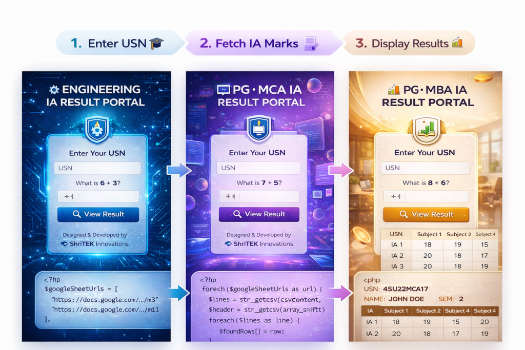 These Student IA Marks portals are designed and developed by ShriTEK Innovations, a student startup incubated at Shridevi Institute of Engineering and Technology (SIET), Tumakuru, to provide a centralized and department-wise Internal Assessment (IA) marks viewing platform for Engineering, PG-MCA, and PG-MBA students, ensuring secure, transparent, and reliable access to academic performance data. The system integrates department-specific Google Sheets as the backend data source, allowing faculty and administrators to efficiently upload, update, and manage IA marks in real time without the need for complex database infrastructure. Through a PHP-based data retrieval mechanism, student records are dynamically fetched using USN-based validation and presented in a structured, responsive, and student-friendly interface, thereby reducing manual effort, minimizing errors, and enhancing the overall efficiency of academic result dissemination.